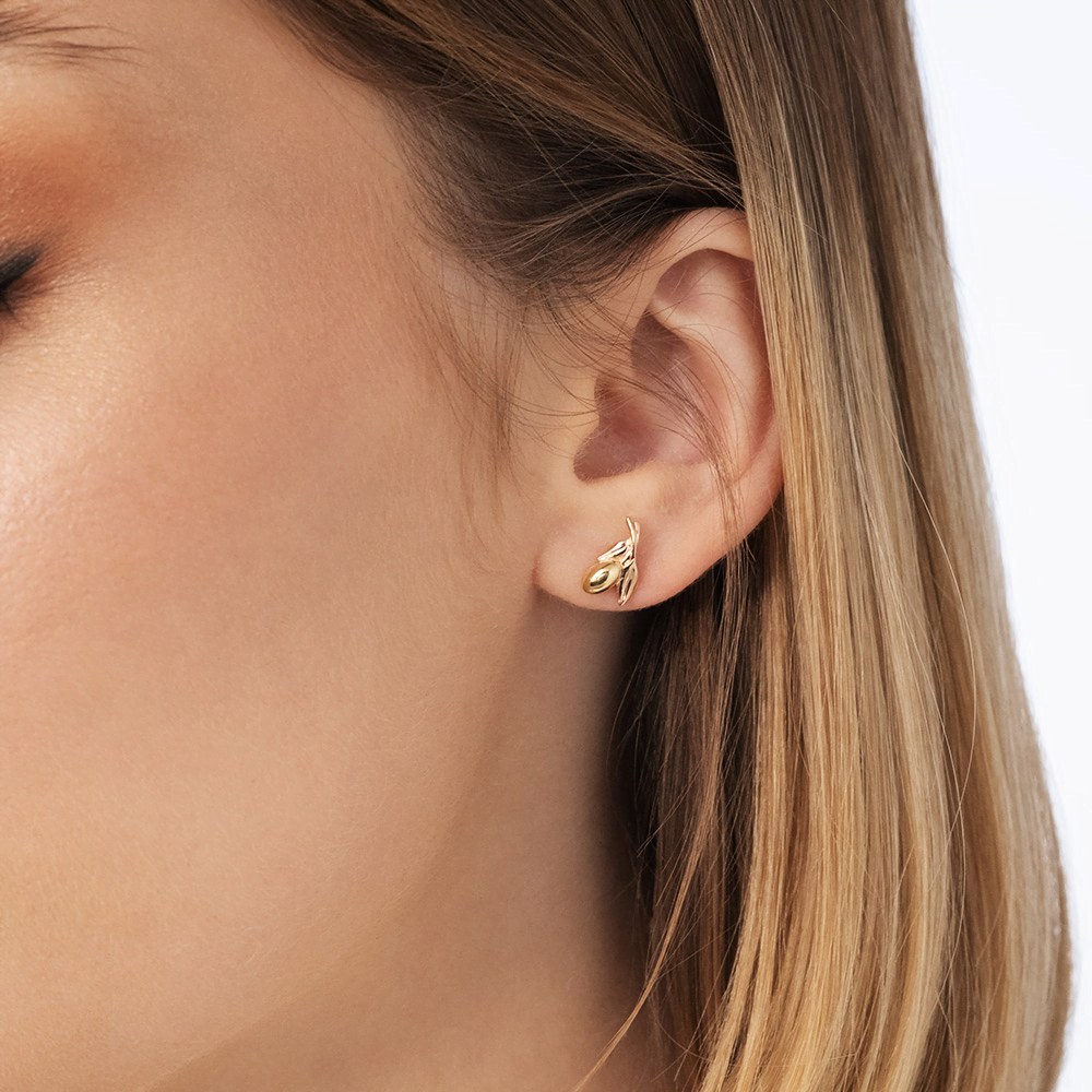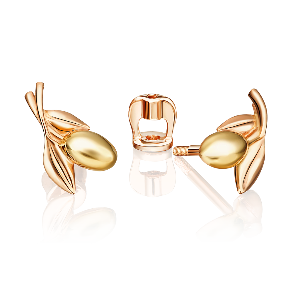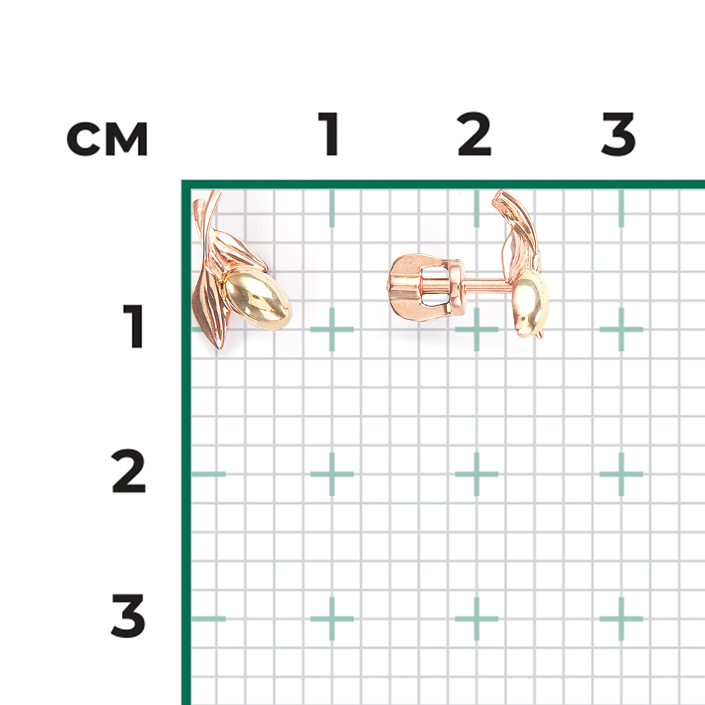 Пусеты-оливки из красного и лимонного (желтого) золота 585 пробы. Дизайн украшения в стиле флористика, минимализм. Силуэт серёг выполнен в виде ветви оливы. Удобный винтовой штифт гарантирует комфортную посадку украшения. Серьги подойдут в качестве коктейльных, в неформальный-гардероб, для повседневного ношения.